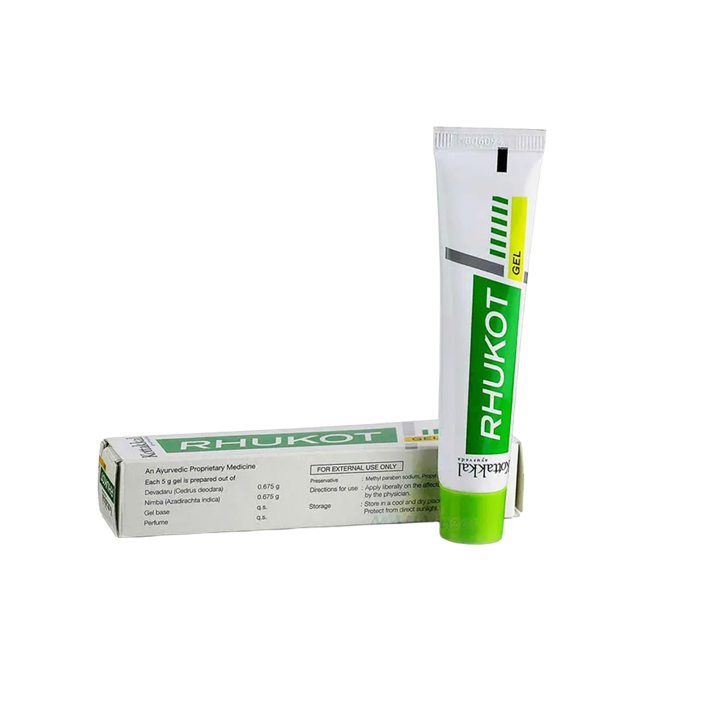 Rhukot Gel: Topical Ayurvedic formulation for external use. Follow label instructions; avoid contact with eyes and open wounds; discontinue if irritation occurs. For medicated linaments/analgesics, consult physician if using with other topical drugs.