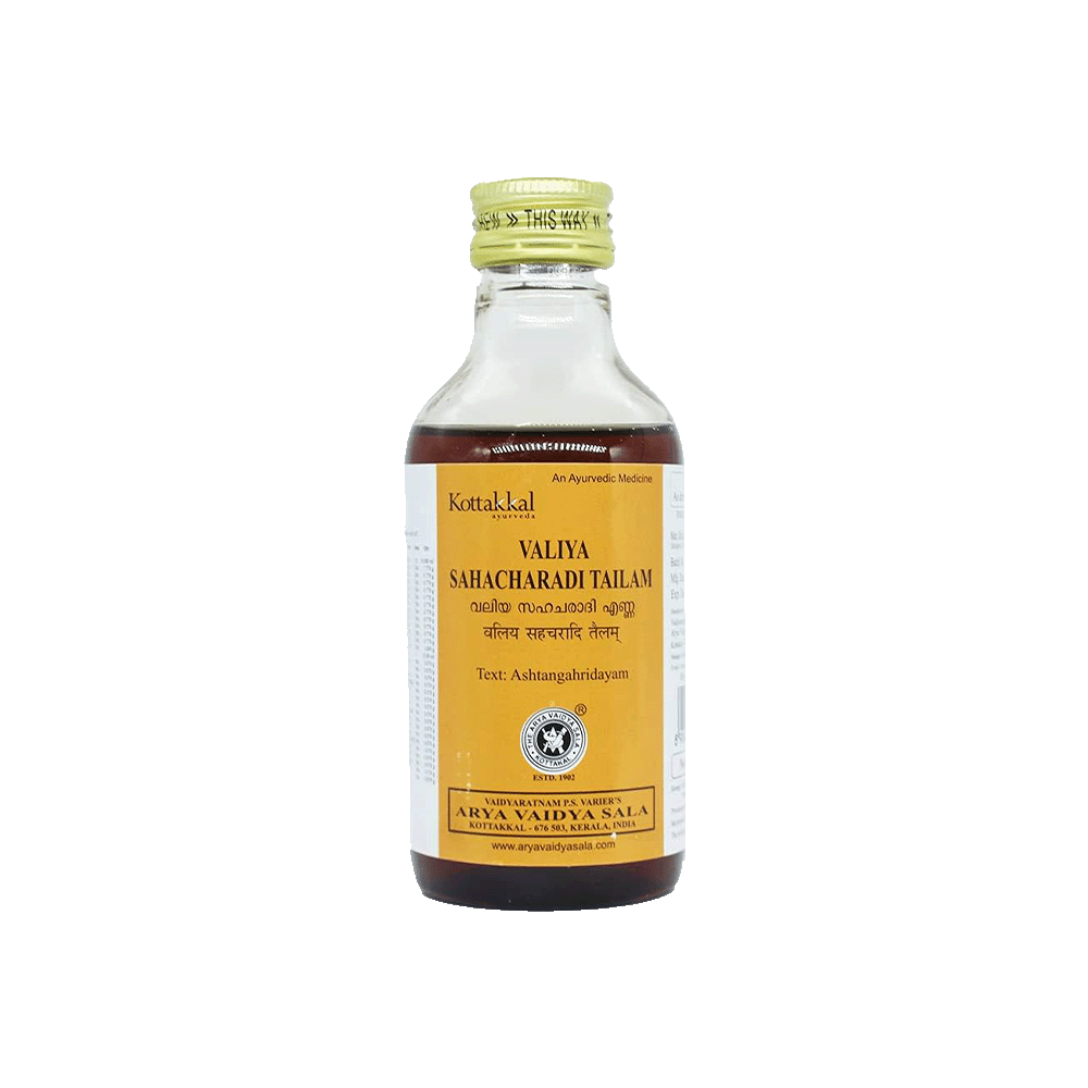 VALIYA SAHACHARADI TAILAM 200ml: A classical Ayurvedic tailam formulation known for its healing and rejuvenating properties. Commonly used in traditional therapies to balance Vata and relieve muscle stiffness or pain. Apply warm or as directed by physician.
